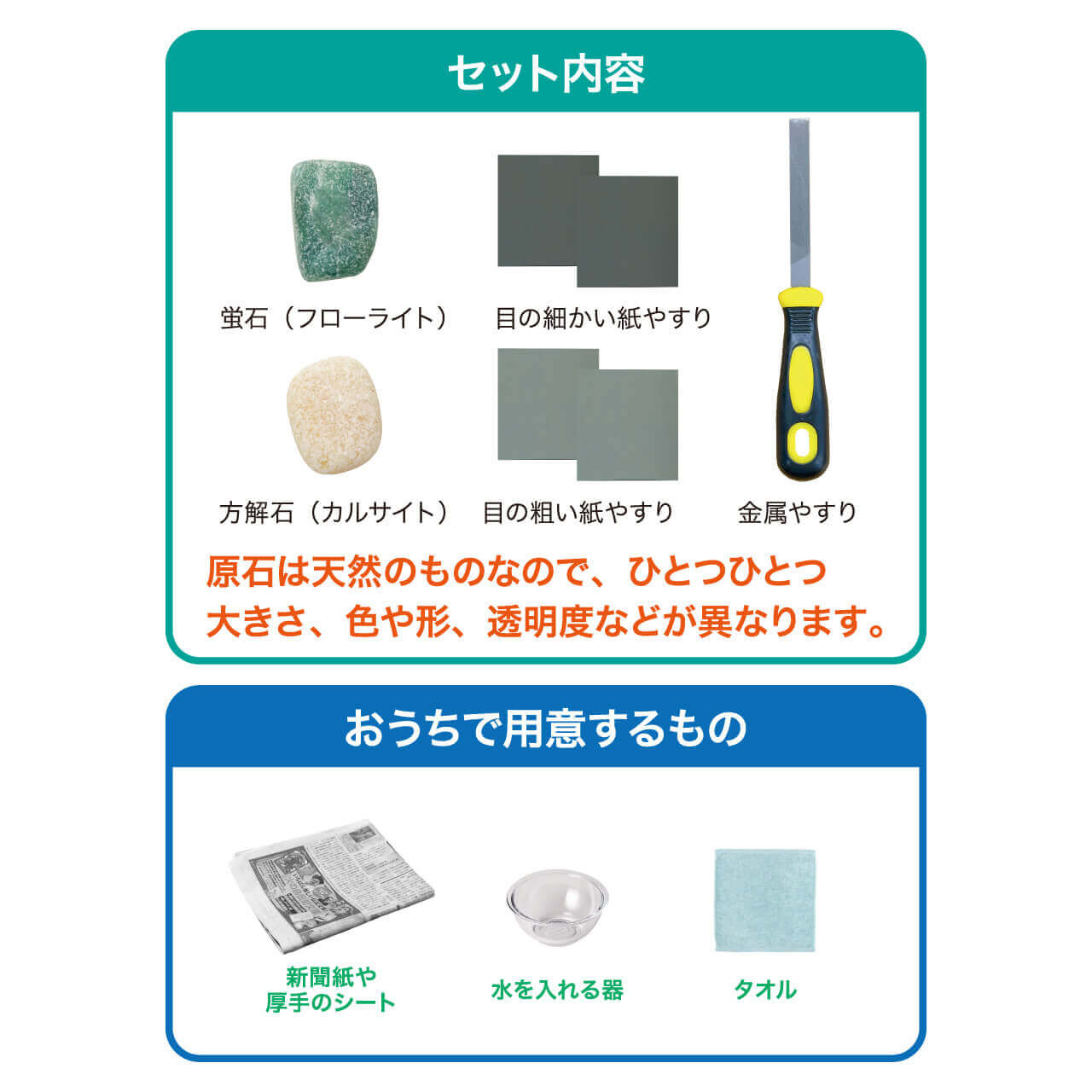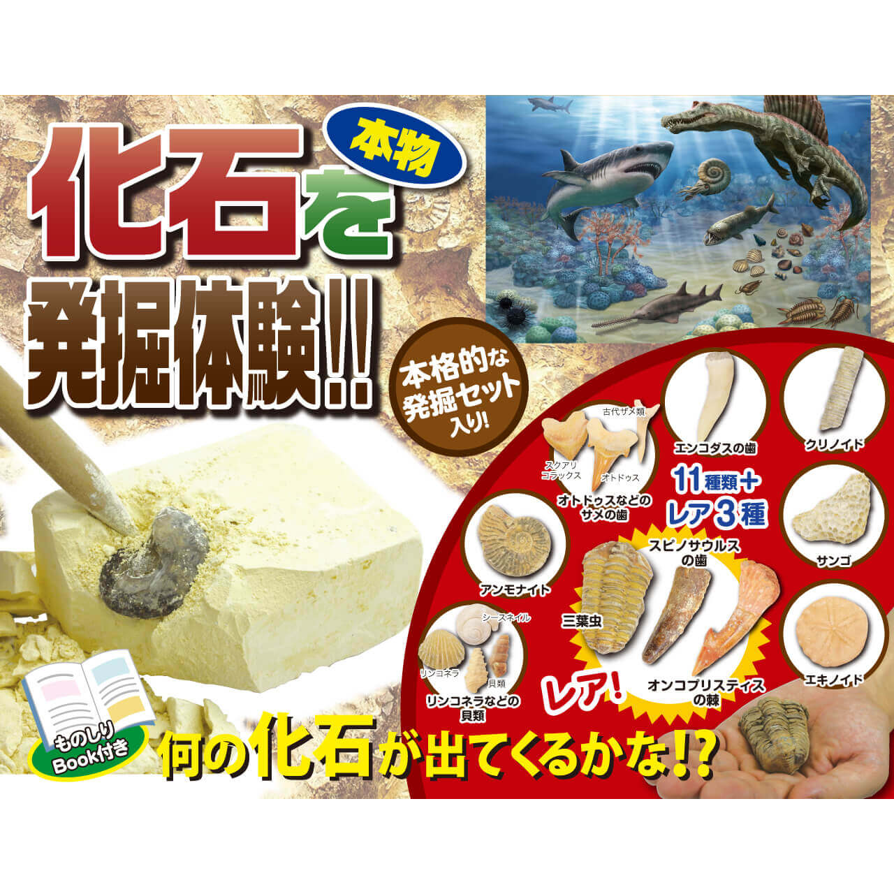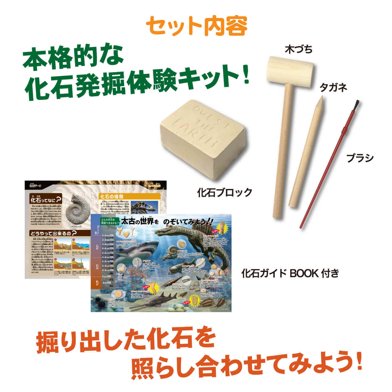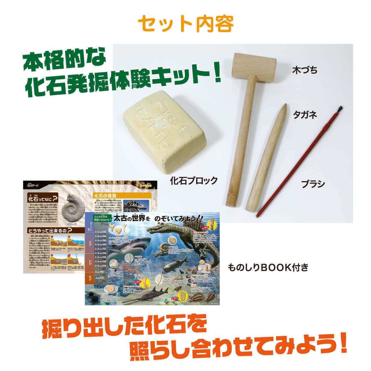 | セット内容 | ・本物の化石入りブロック(石膏) ・発掘キット(木づち、タガネ、ブラシ) ・化石の種類や発掘の歴史が学べるものしり図鑑 |